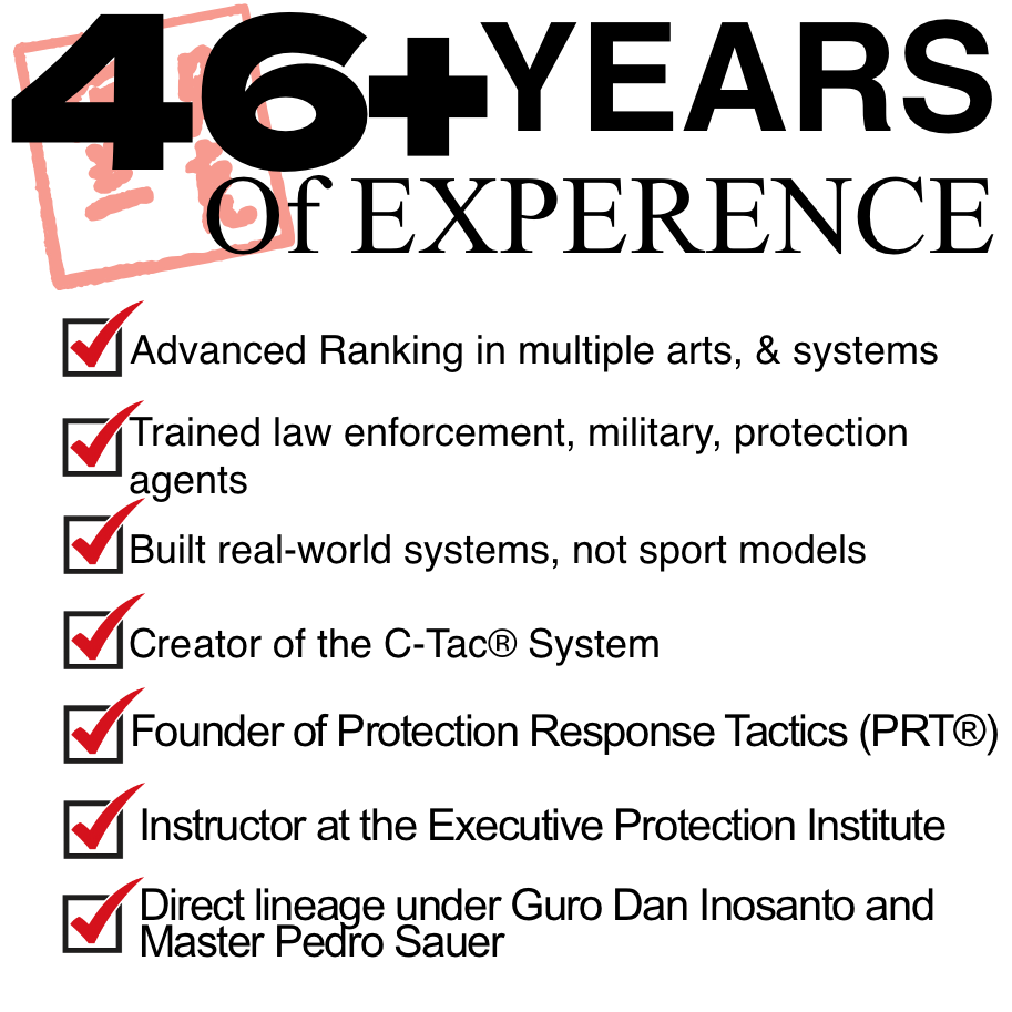 Your thoughtful approach to the need for protectors and their unique need for a system of protecting their clients developed into the absolute best defensive tactics system for the EP profession, bar none. Several years ago, when we first approached you to develop a specific defensive tactics system for protectors, as most we using borrowed tactics from the police and the military, I remember that before you recommended anything, you questioned experienced practitioners and those who had to protect others and what their specific needs were. Then you began to develop a system that is “client-based” and not “self-defense”. This is extremely important in our profession, where we must be focused on keeping a third party safe from harm’s way.