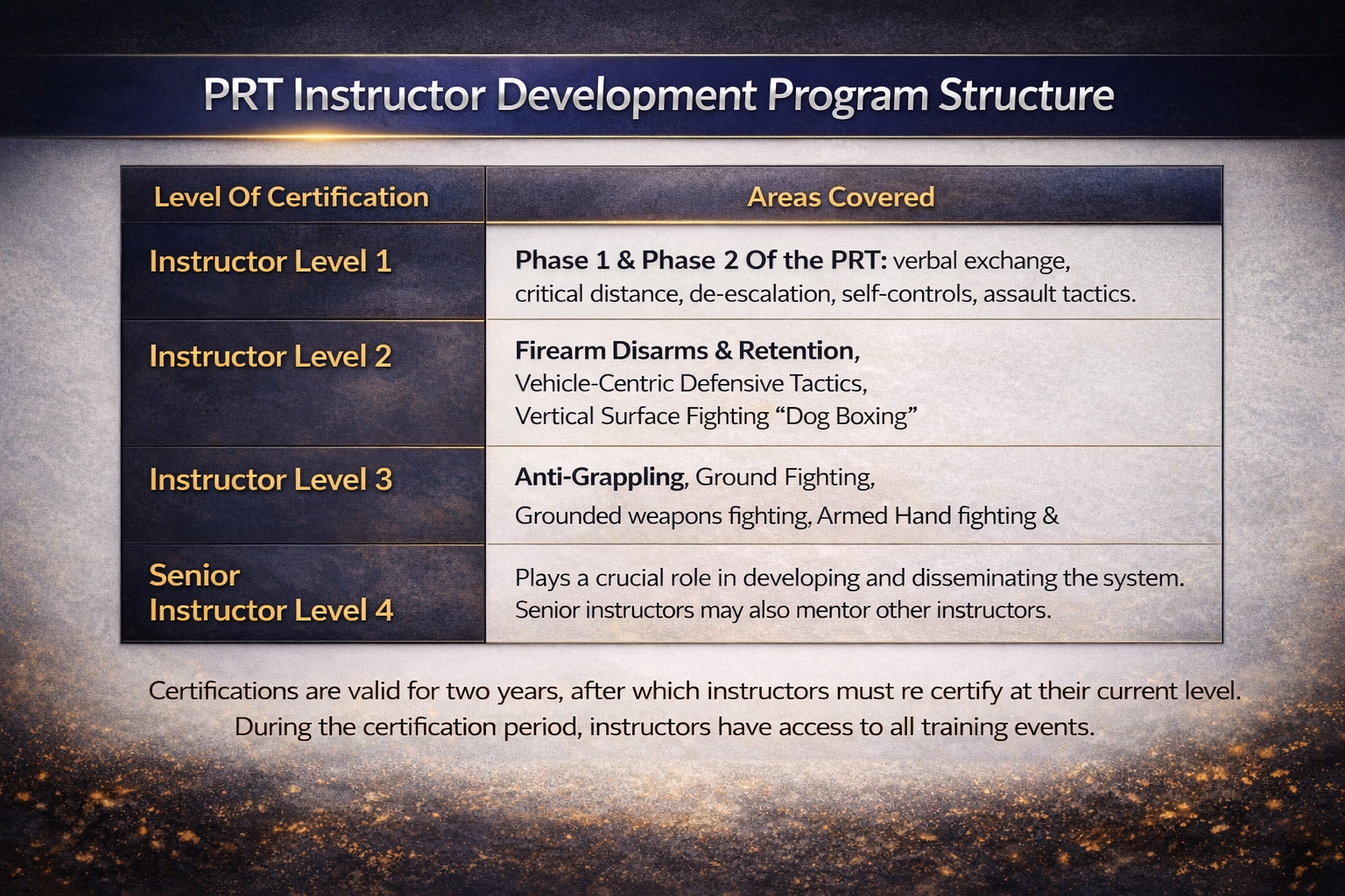 Certifications are valid for two years, after which instructors must recertify at their current level. During the certification period, instructors have access to all training events.